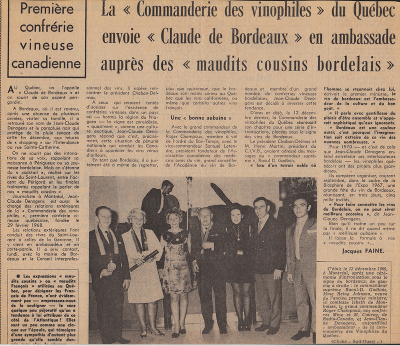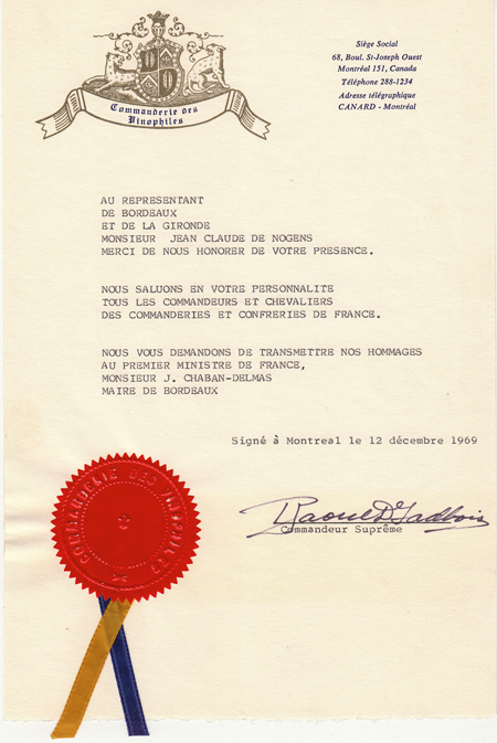Une de mes premières mission de confiance en l’honneur de ce noble breuvage de France, et particulièrement à la gloire du vin de Bordeaux, avait été cette lettre signée à Montréal le 12 décembre 1969, par le Commandeur Suprême Messire Raoul GADBOIS, qui mentionne une prestigieuse « Commanderie des Vinophiles ».